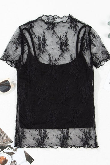 Floral Sheer Mesh Short Sleeve Top and Cami Set